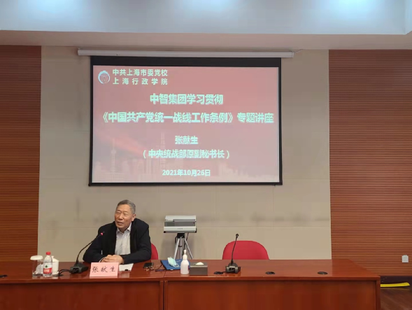 為深入推進中智集團統(tǒng)戰(zhàn)工作,切實發(fā)揮好統(tǒng)戰(zhàn)人士在新時代履行新使命中的重要作用,2021年10月26日,中智集團在中共上海市委黨校(上海行政學(xué)院)舉辦《中國共產(chǎn)黨統(tǒng)一戰(zhàn)線工作條例》專題學(xué)習(xí)班,中央統(tǒng)戰(zhàn)部原副秘書長、干部局局長、研究室主任、新聞發(fā)言人張獻生作專題輔導(dǎo)解讀。集團統(tǒng)戰(zhàn)干部和部分統(tǒng)戰(zhàn)代表人士參加學(xué)習(xí)班。
